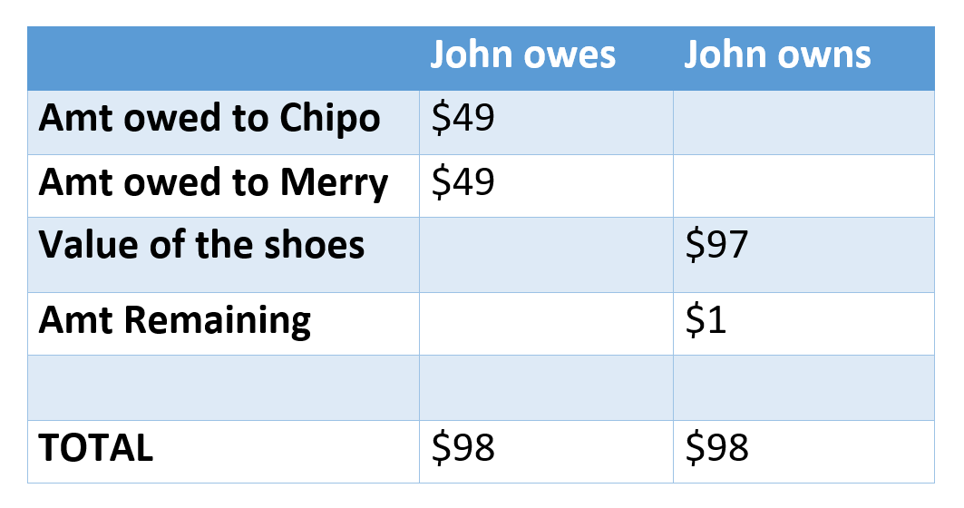 In fact it is never guaranteed that, if we add the unrelated amounts in that way, we will get $100. What is guaranteed however is that the total amount of what John owes will perfectly cancel out what he owns. Considering that he now owns shoes worth $97 as well as that extra $1, and that he owes Chipo and Merry $49 each, we can draw up a table of what he owes against what he owns, like so: